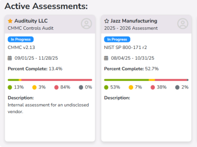 Audituity provides detailed reports and visual dashboards that display compliance progress within each framework and assessment. These tools help teams monitor control completion, track evidence status, and identify areas that need attention—giving compliance professionals a clear, organized view of their overall readiness for audits or reviews.
